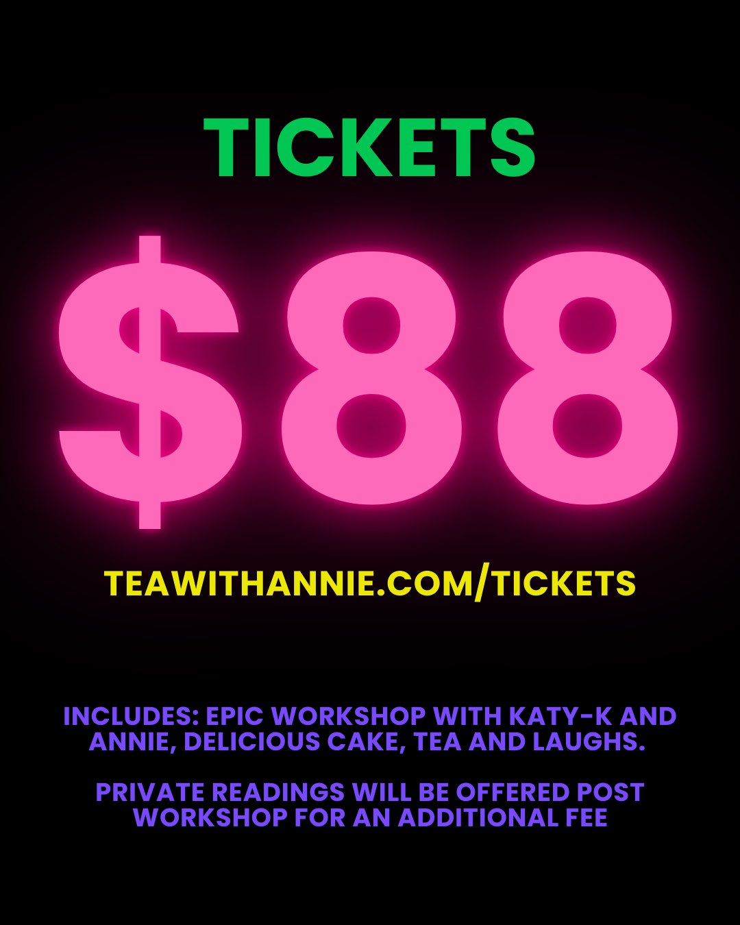 This workshop runs for approximate 1.5 hours and an opportunity for individual private readings with either Katy-K or Annie will be available at the conclusion of the workshop for an additional fee.